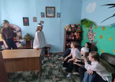 На локации «Штаб» участники разгадывали военные пословицы и поговорки с помощью цифровых и буквенных кодов. В «Политотделе» дети изучали военные профессии времён Великой Отечественной войны. Они играли в игру «Кто я?», угадывая профессию по описанию.