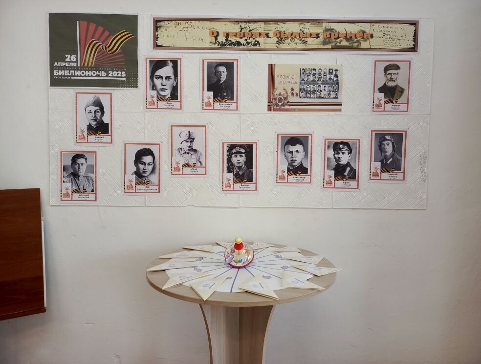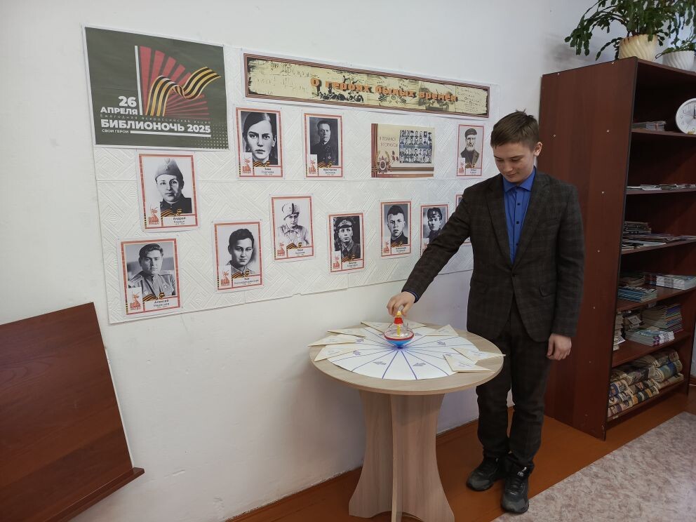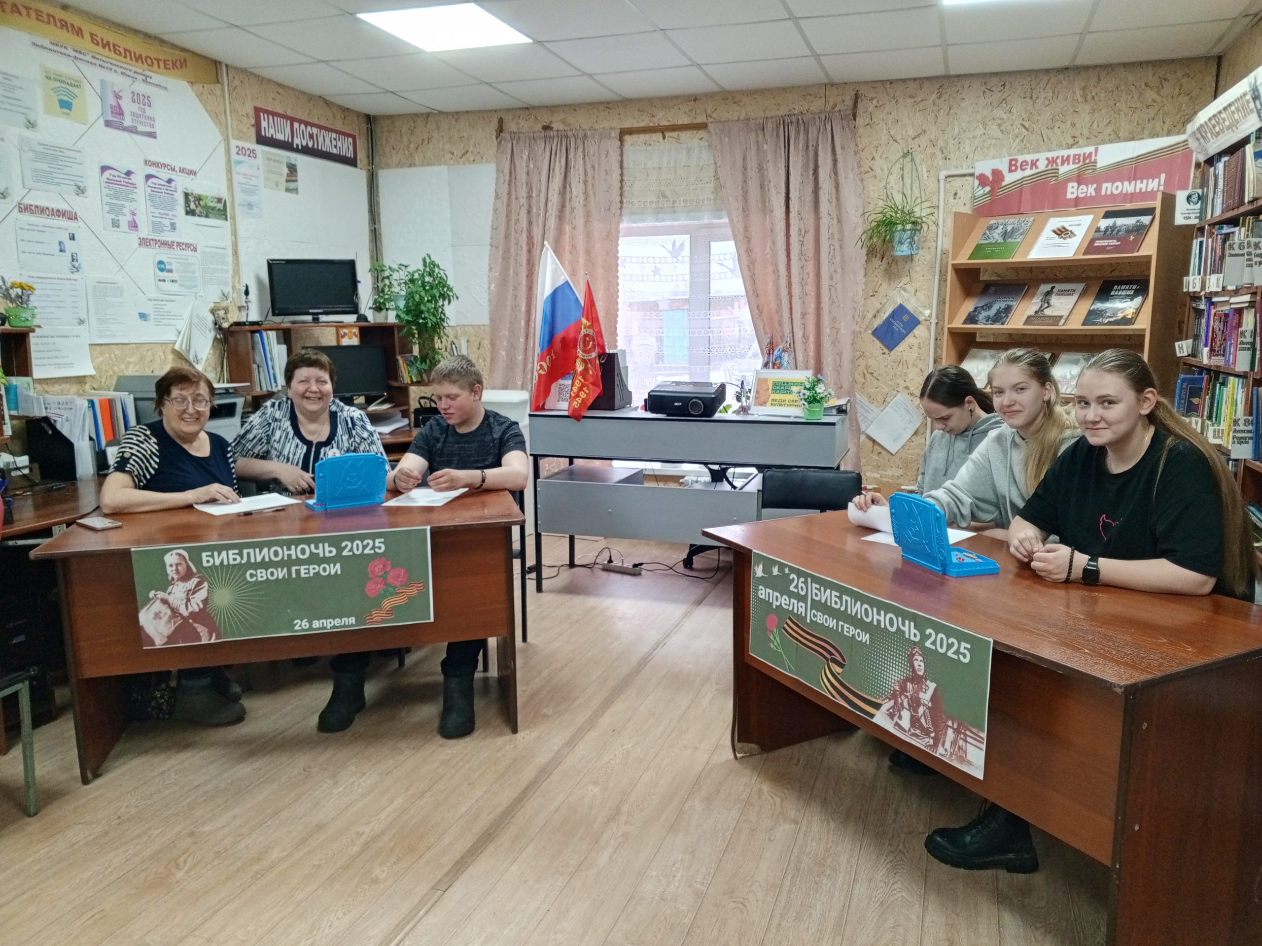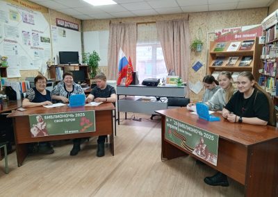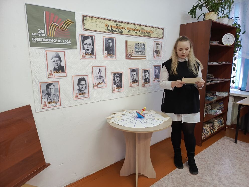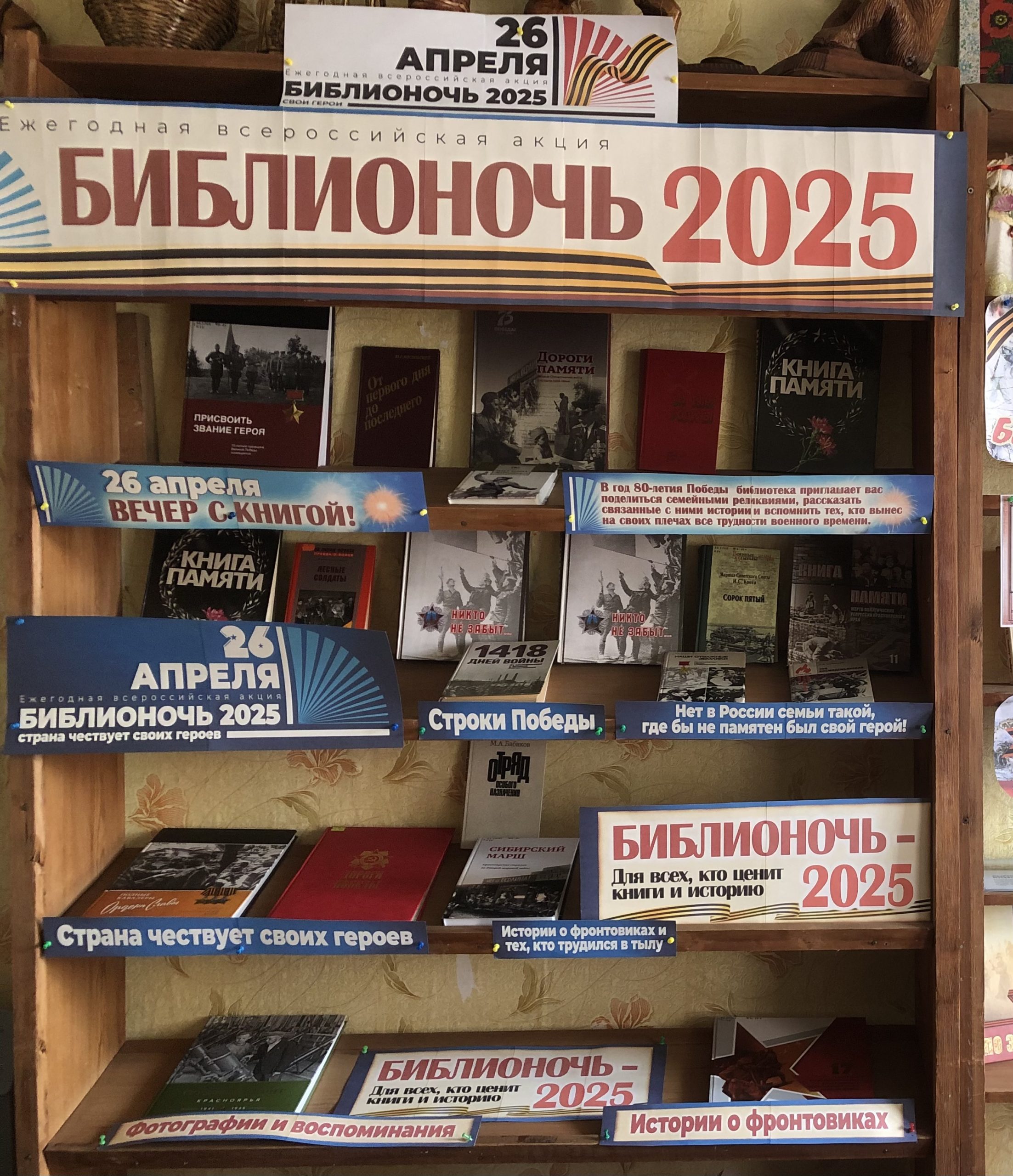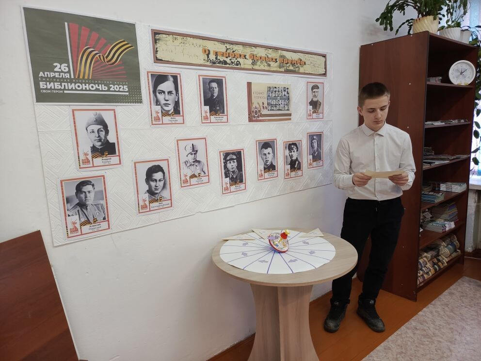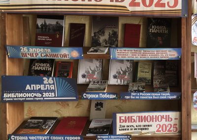 Ежегодная всероссийская акция «Библионочь» — это акция, которая объединяет любителей чтения и книги в рамках культурной ночи, которая была посвящена Году защитника Отечества и 80-летию Великой Победы. Тема акции — «Свои герои». Девиз: «Нет в России семьи, где бы ни был памятен свой герой».