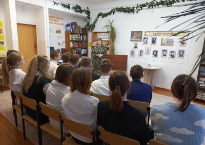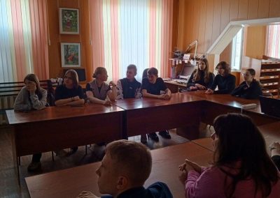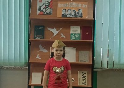 Для участников мероприятия была организована беседа у книжной выставки «В сердцах и книгах — память о войне». На выставке были представлены научно-документальные и художественные произведения последних лет о Великой Отечественной войне. Каждое из них — это не только исторический источник, но и живое свидетельство мужества, стойкости и героизма миллионов людей. Библиотекарь рассказывал, сопровождая свой рассказ стихотворениями поэтов-фронтовиков: Константина Симонова, Юлии Друниной, Александра Суркова и Эдуарда Асадова.