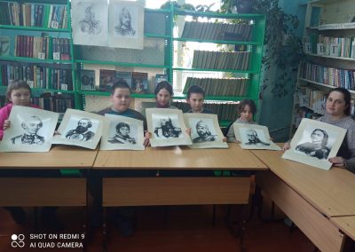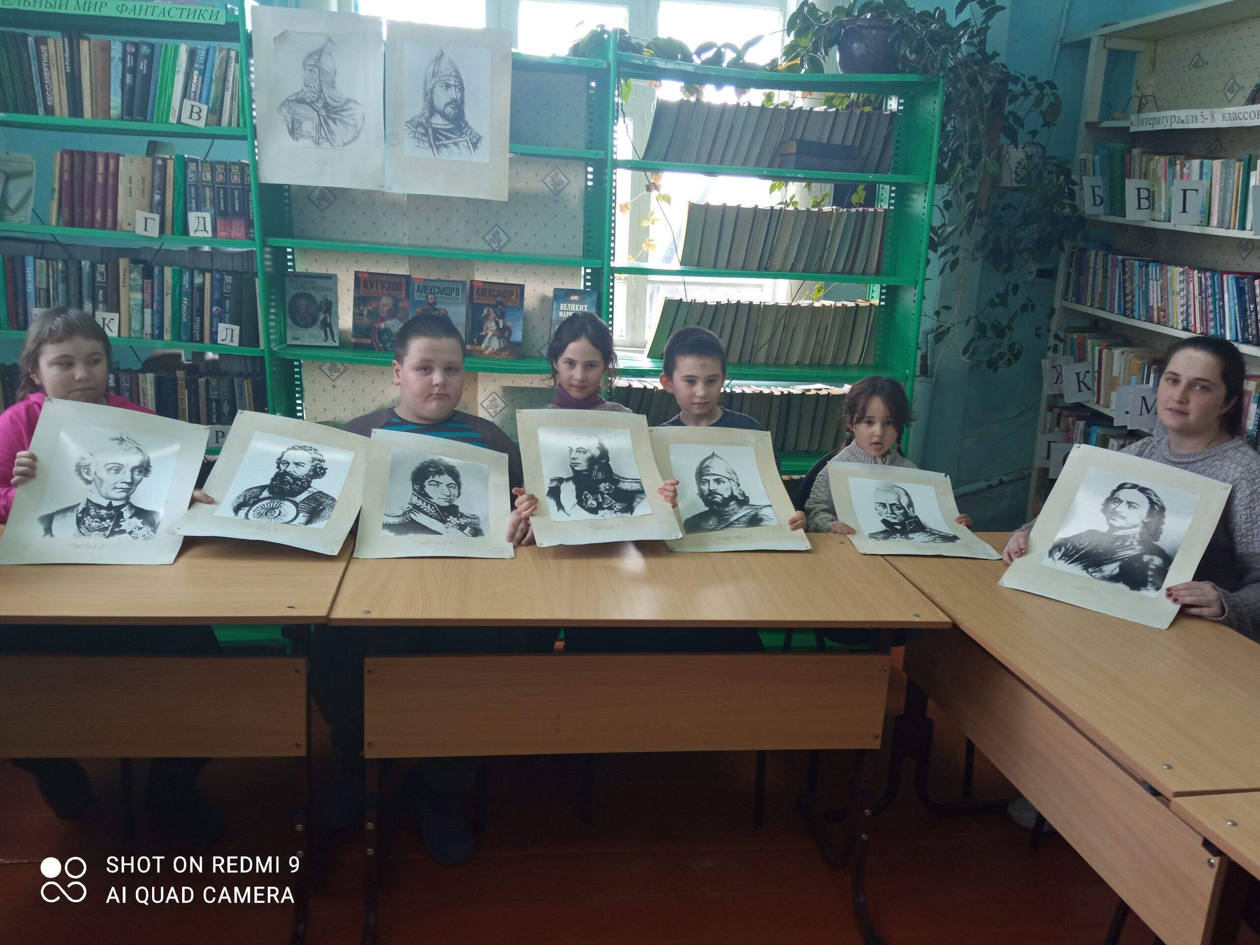 Вторая часть мероприятия прошла для дошкольников и учащихся. Ребята прослушали информацию о защитниках Отечества прошлых и нынешнего веков. С интересом рассматривая портреты героев, дети задавали много интересующих их вопросов, а особо активные ребята решили нарисовать понравившихся им героев. Интересно и продуктивно прошло рассуждение на тему героизма и защиты родного Отечества.
