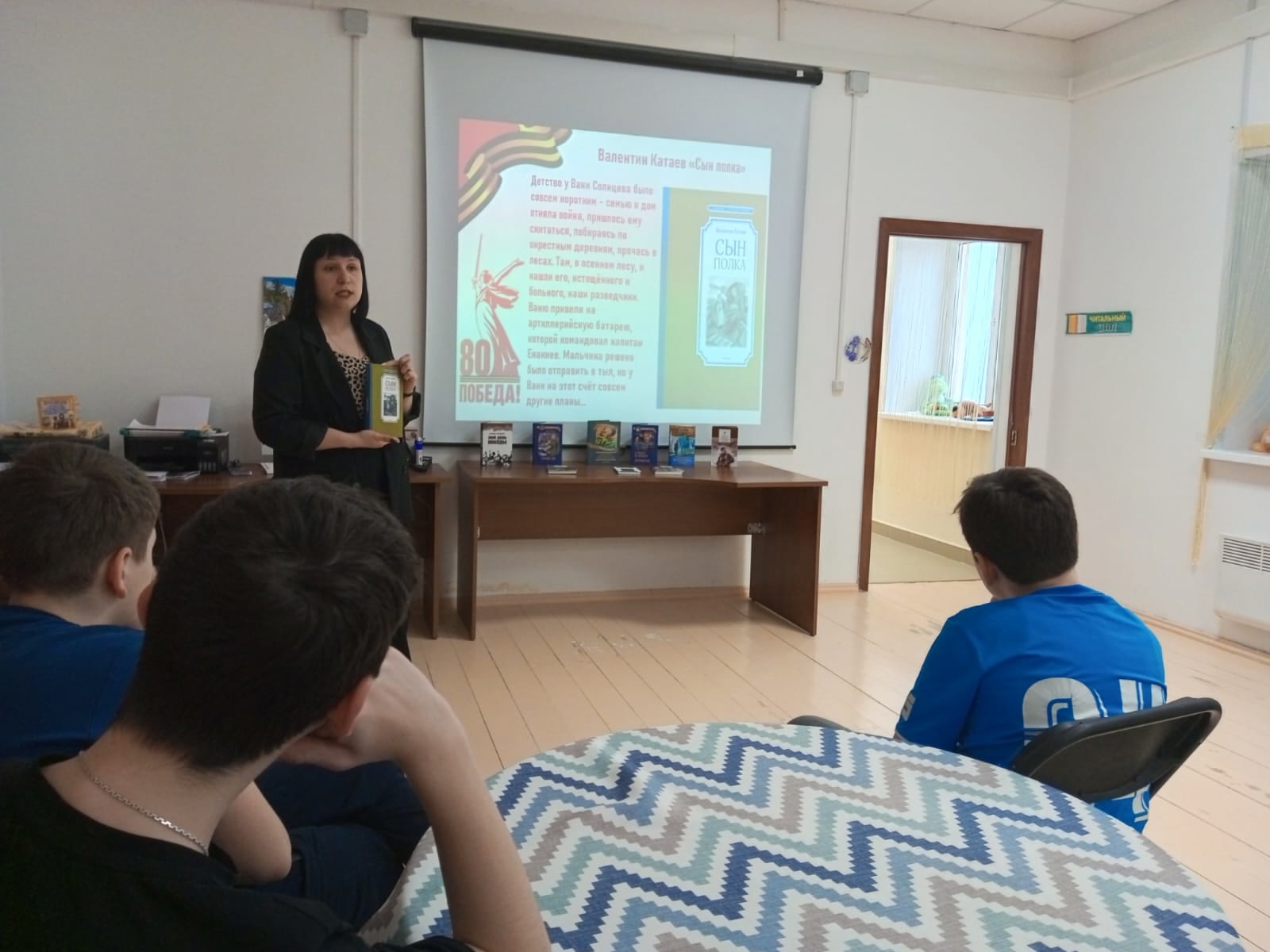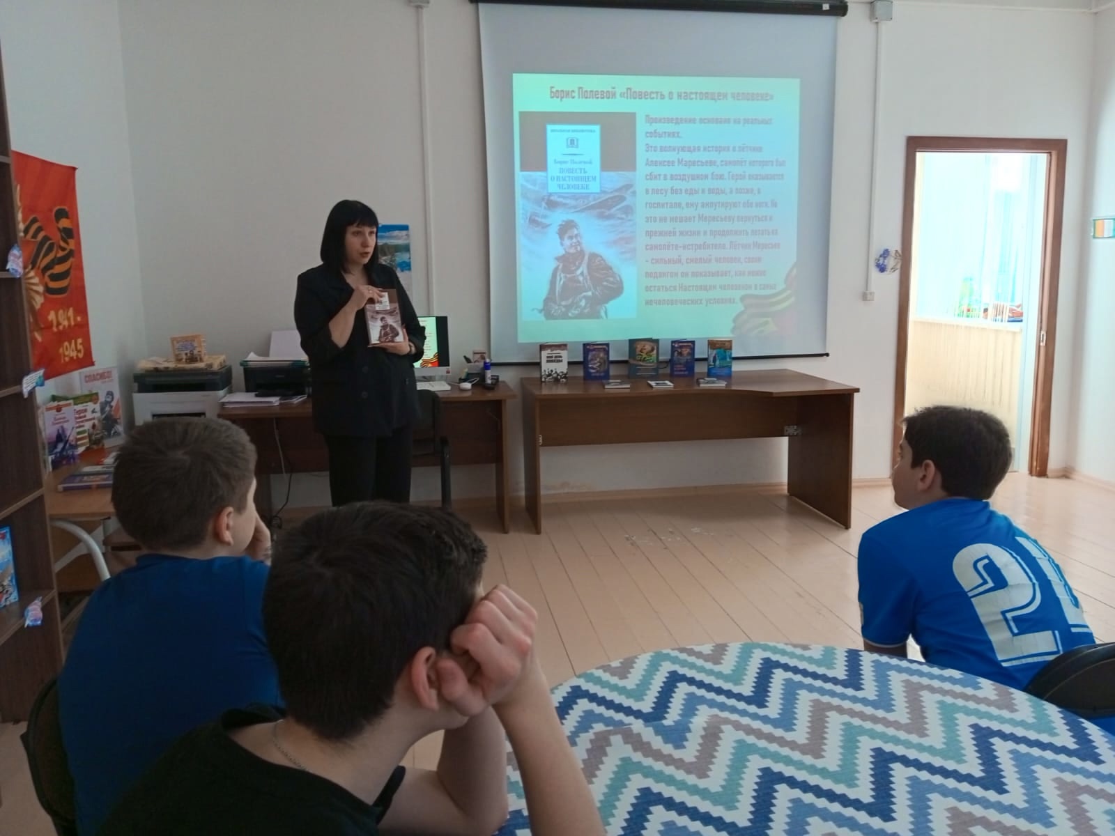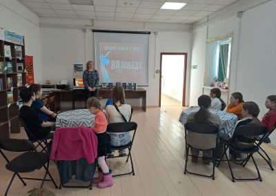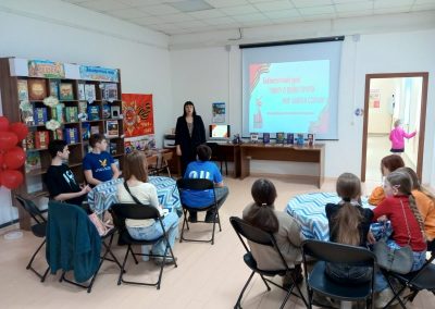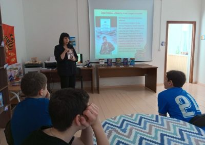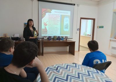 Сотрудник библиотеки п. Новоангарск провела для учащихся Детской Художественной Школы библиотечный урок «Книги о войне прочти — мир навеки сохрани!» В ходе мероприятия ребята познакомились с авторами военной прозы, со знаменитыми произведениями, описывающими тягостные годы Великой Отечественной войны. Вниманию читателей был представлен обзор книг, а с помощью мультимедийной презентации ребята познакомились с кратким содержанием, главными героями и иллюстрациями книг о войне.