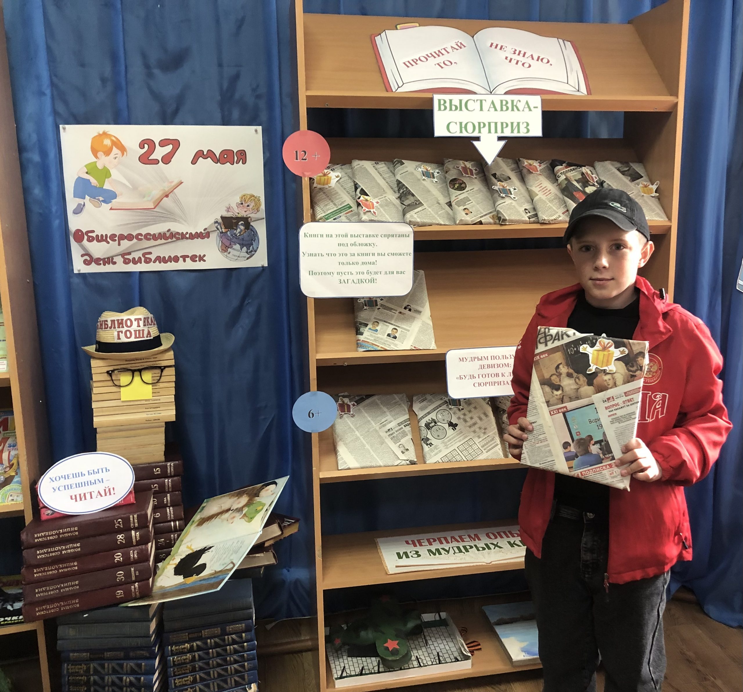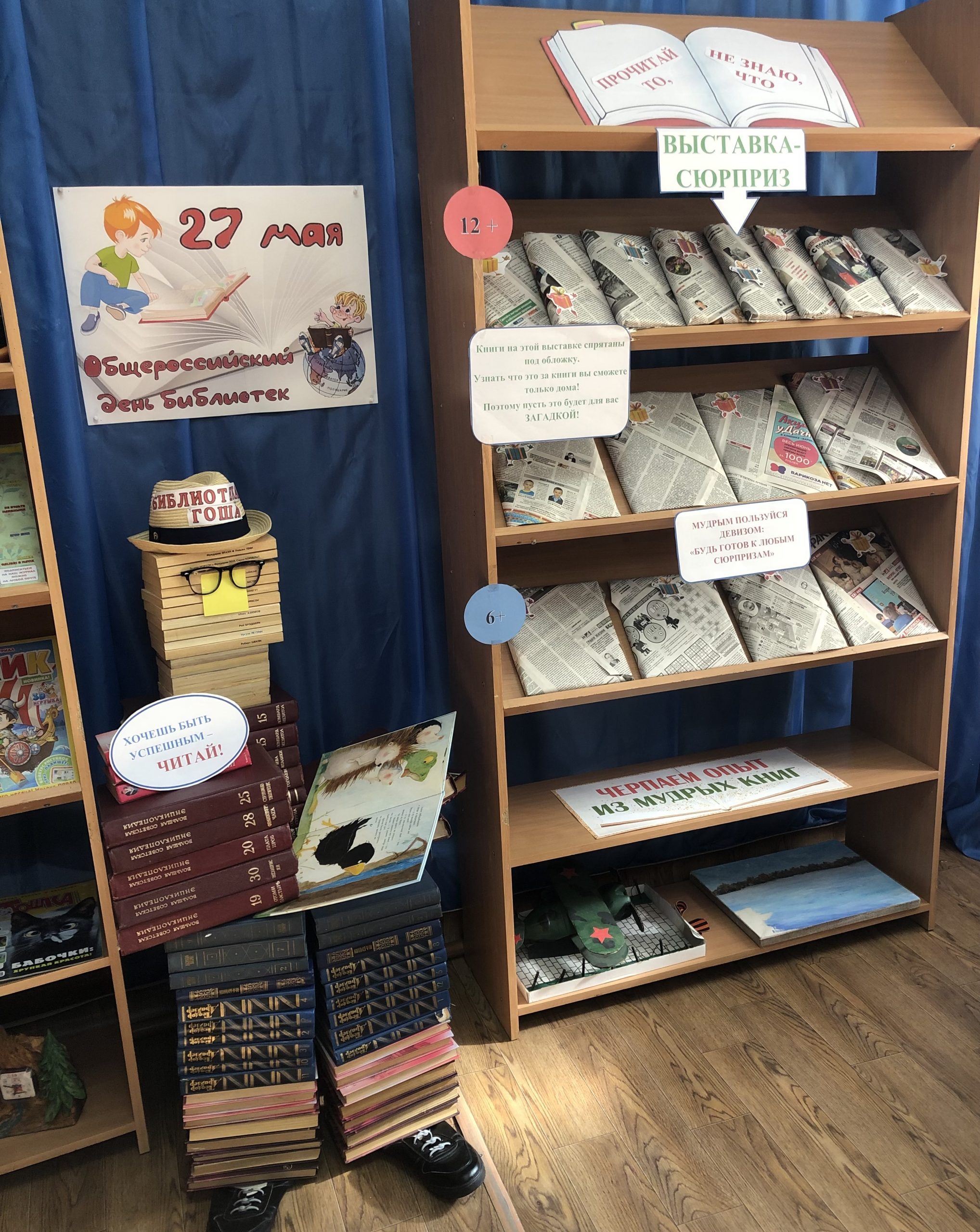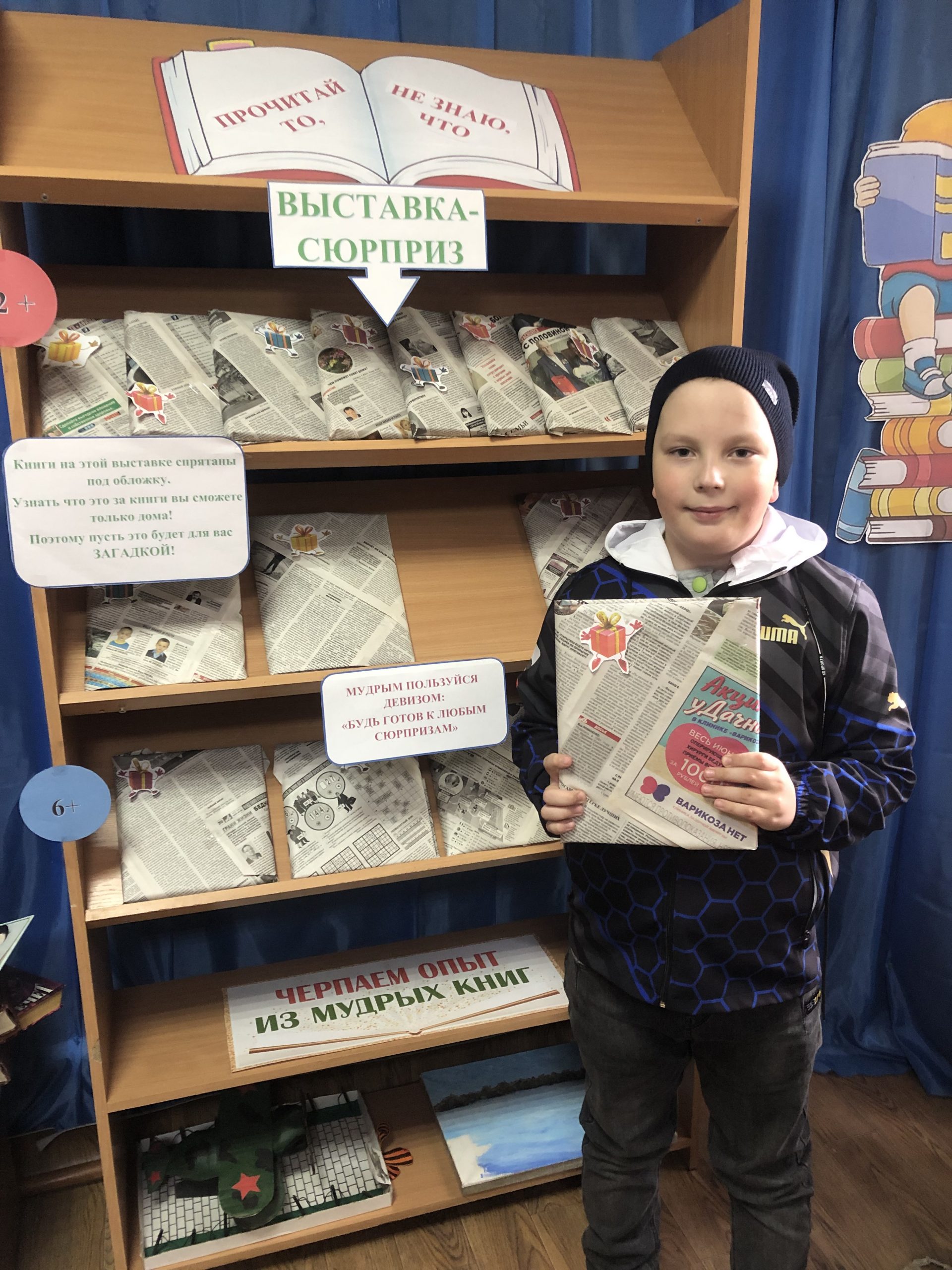Такую же выставку с сюрпризом организовали и для юных читателей в библиотеке п. Орджоникидзе. На выставке были представлены книги разных жанров для читателей от 6 лет. Под упаковкой из слоя газетной бумаги притаились книги, узнать название и авторов которых, читатели смогли только тогда, когда выбрали и принесли книгу домой. Наши юные читатели не упустили шанс поучаствовать в литературном приключении!
