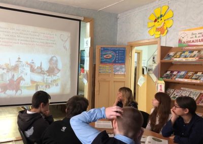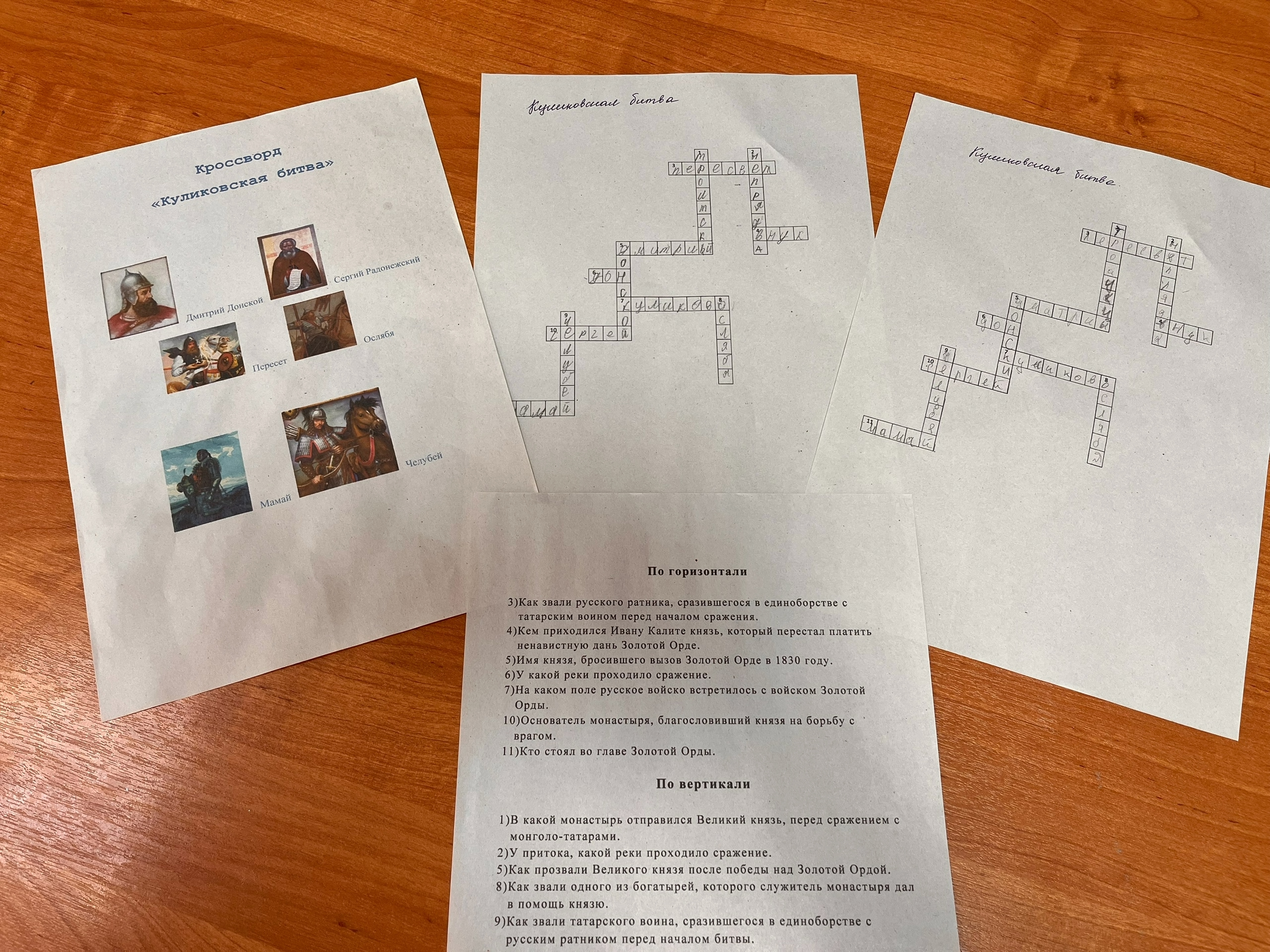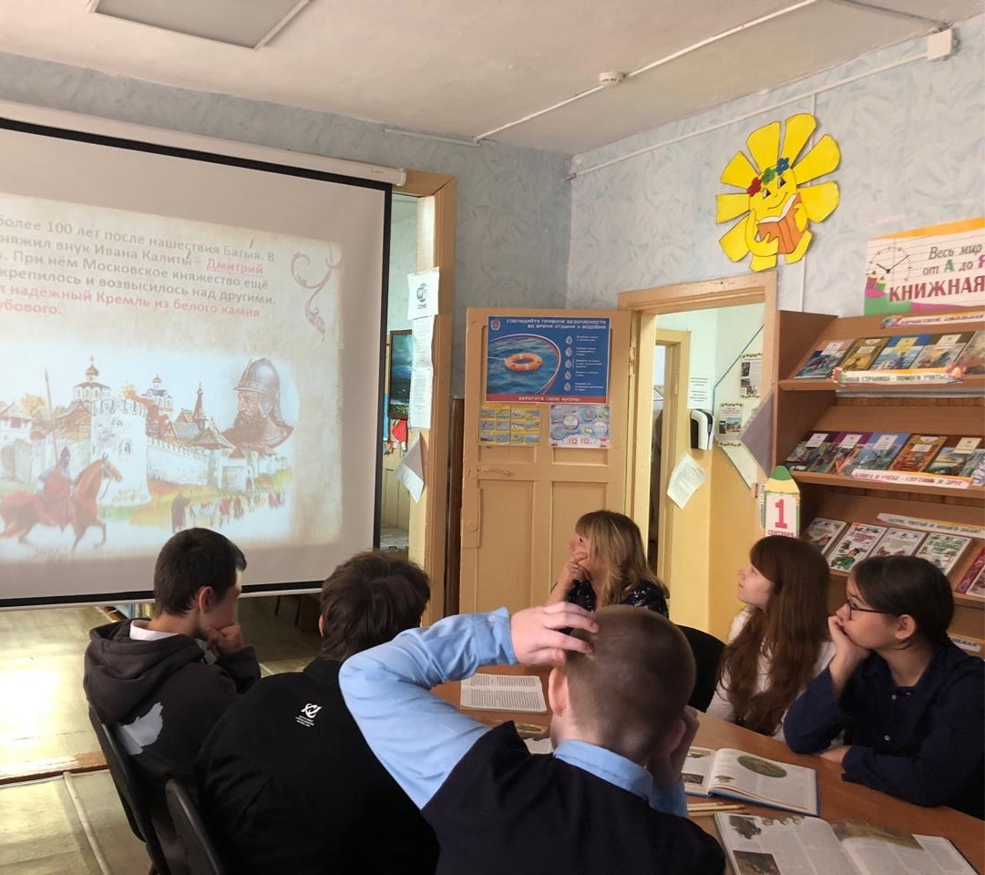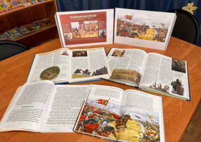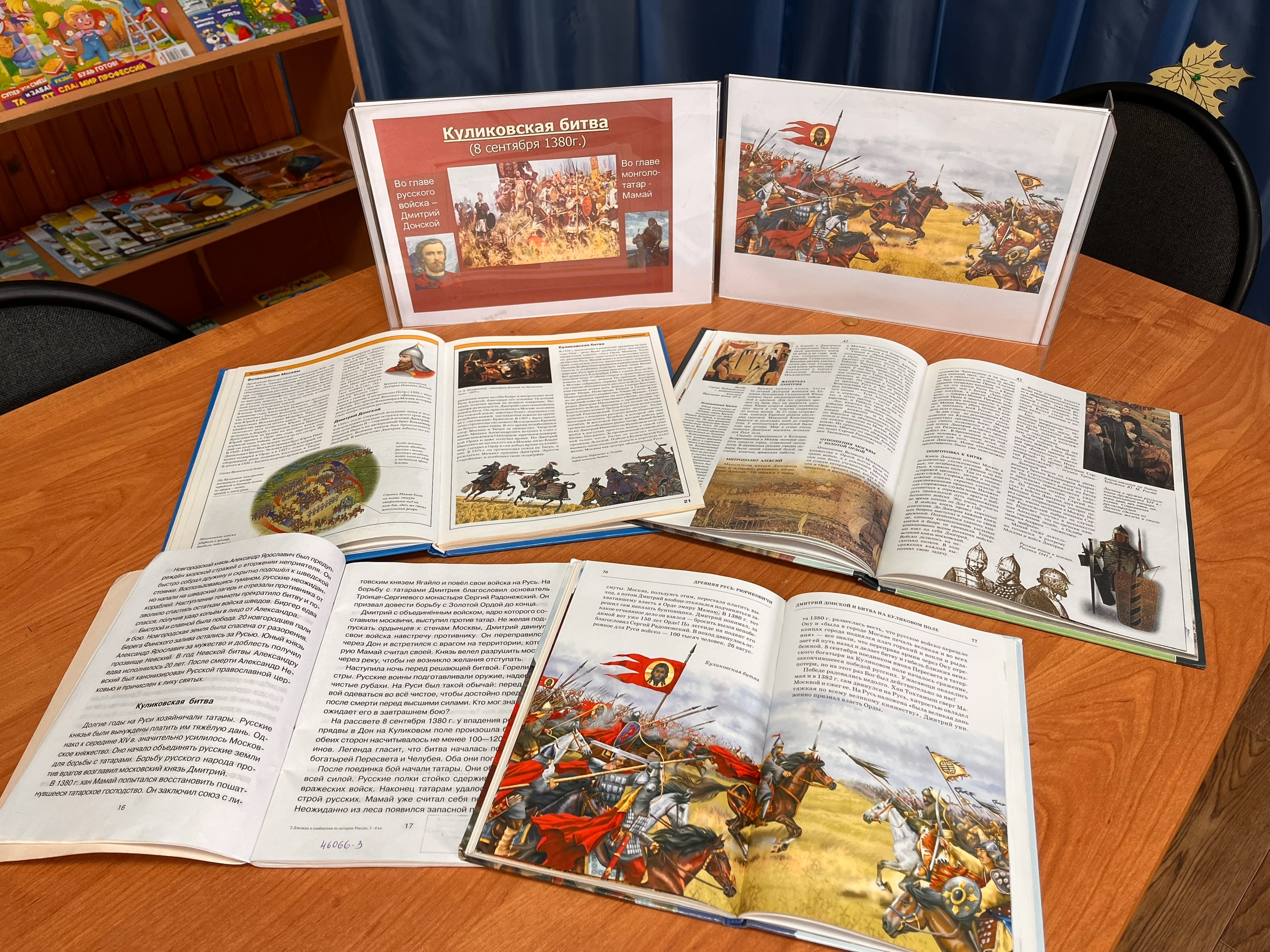 Учащихся школы познакомили с историей победы русских полков над монголо-татарскими войсками на Куликовом поле. В ходе беседы по презентации, сопровождаемой рассказом библиотекаря, ребята погрузились в атмосферу русской воинской доблести, узнали о событиях, предшествовавших Куликовской битве. Познакомились с героями, имена которых сохранила история, узнали, кем был Дмитрий Донской, Челубей и Пересвет. Ребятам представили подборку исторической и художественной литературы о битве. Завершилось мероприятие разгадыванием кроссворда данную тему, где ребята отлично справились со всеми вопросами.