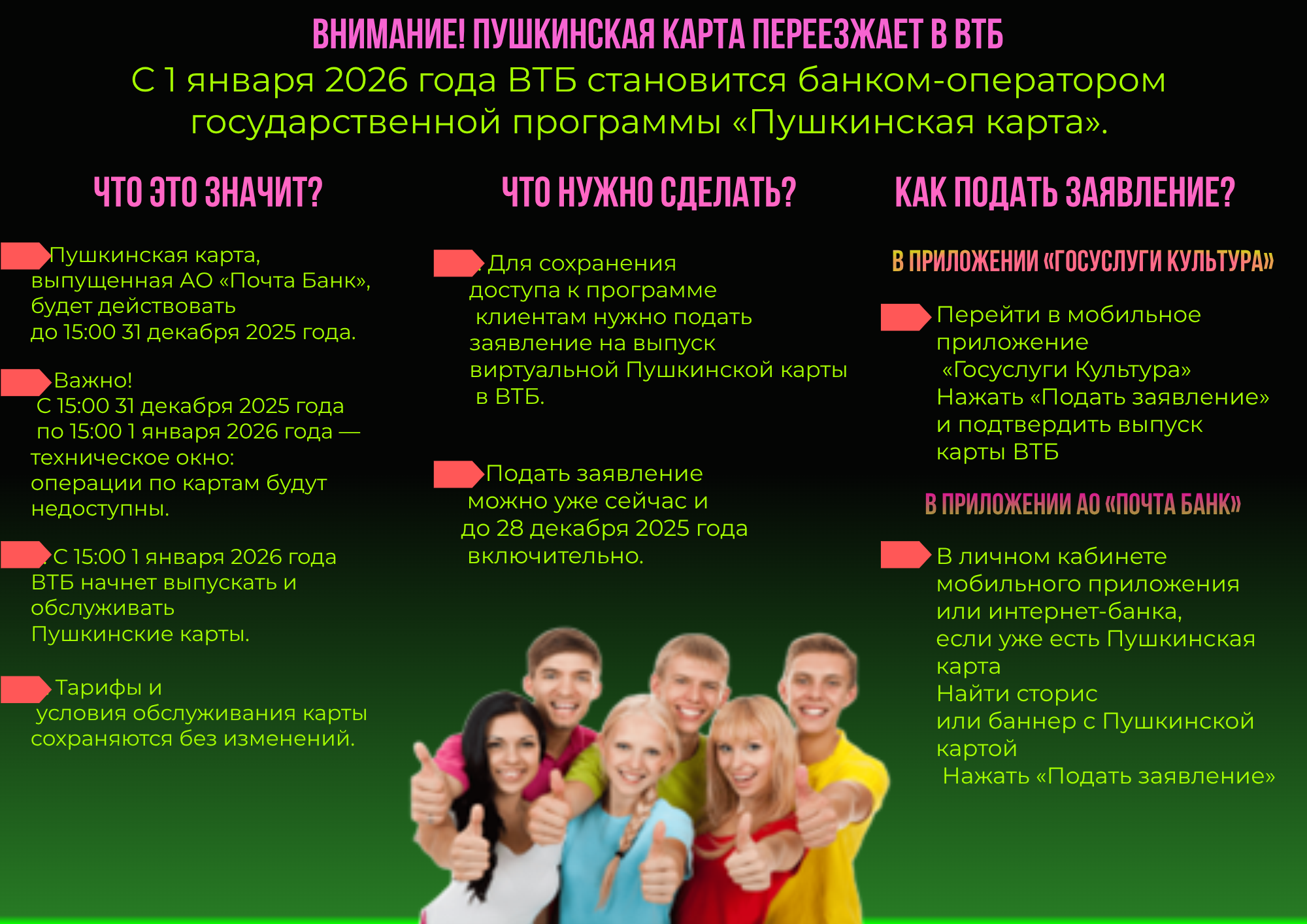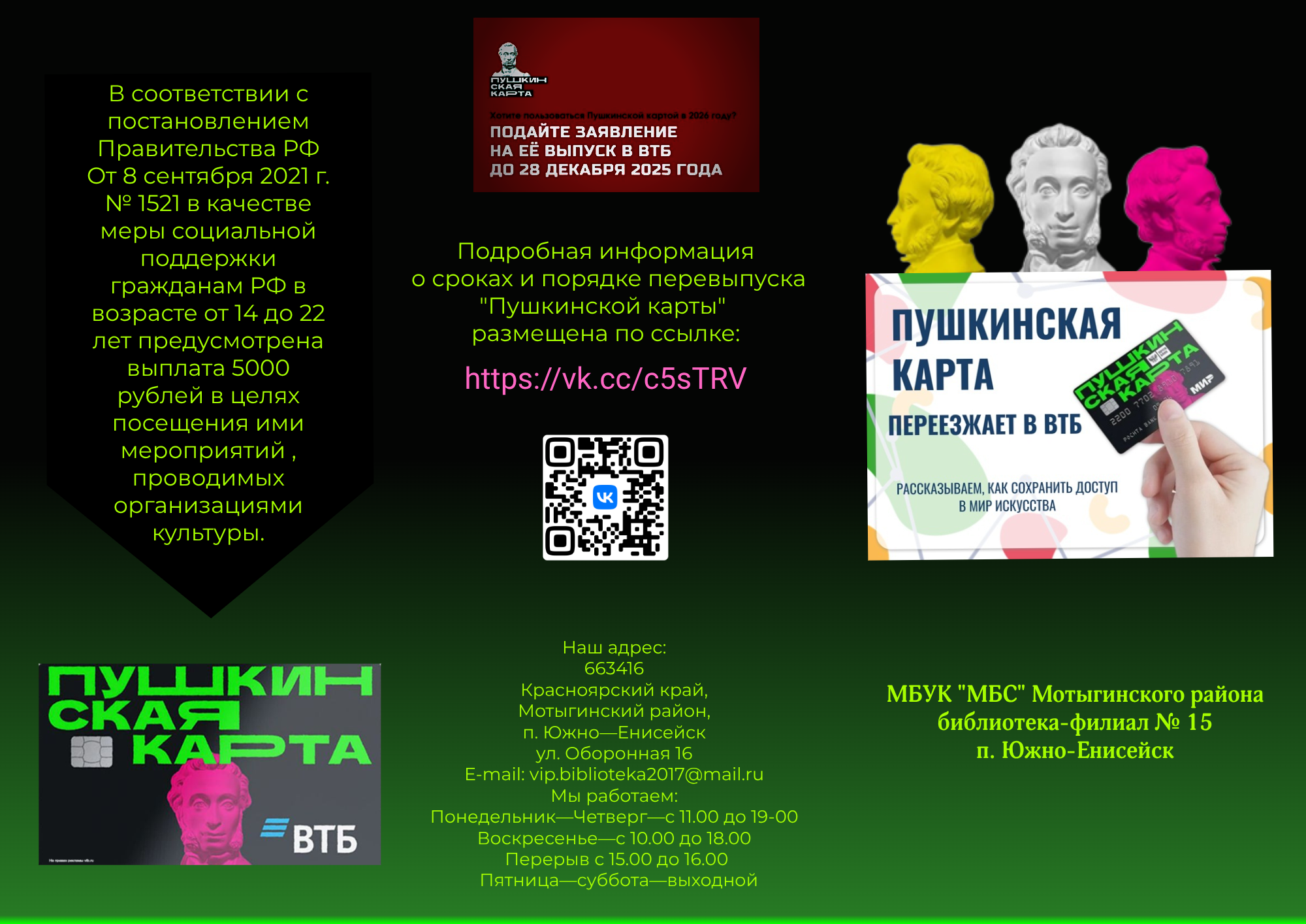 В целях продвижения программы «Пушкинская карта» и популяризации её среди молодёжи 10 ноября библиотекарь п. Южно-Енисейск провела информационный час «Пушкинская карта. Теперь в ВТБ» для учеников 8, 9, 11 классов МБОУ «Южно-Енисейская СОШ». Ребятам рассказала о том, что «Пушкинская карта» позволяет молодежи от 14 до 22 лет покупать билеты на культурные мероприятия за виртуальные деньги, начисленные на специальную банковскую карту. Это очень удобно, и даёт возможность бесплатно посещать учреждения культуры. Также доведена информация о том, что с 2026 года Пушкинская карта перейдет под управление ВТБ. Чтобы воспользоваться Пушкинской картой в 2026-м, нужно подать заявление на её выпуск в ВТБ. До 28.12.2025 года в приложениях «Госуслуги Культура» или «Почта Банк». С 01.01.2026 года в приложениях «Госуслуги Культура» или «ВТБ Онлайн» (для клиентов ВТБ). В завершении мероприятия ребята получили буклеты с напоминанием и инструкцией как переоформить уже имеющиеся «Пушкинские карты».