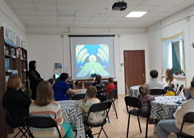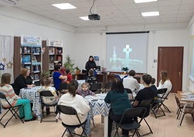 Ведущая рассказала гостям о праздновании Рождества Христова, Сочельнике, Святках, Колядках. Из мультфильма «Рождество Христово» участники мероприятия узнали о библейских событиях, которые произошли более 2000 лет назад. Познакомились с обычаями и традициями проведения рождественского сочельника, слушали песни и стихи, которые обычно исполняют во время колядок. Встреча завершилась изготовлением ангела из синельной проволоки и семейным чаепитием.